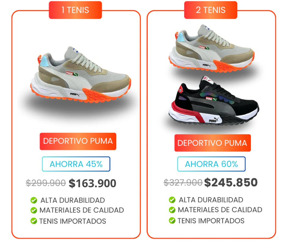 Dos pares de este puma saldrían 327.800 cop, pero comprando ahora tendrás un 60% de descuento y solo pagarás 245.850 cop por los dos pares y podrás elegir dos colores y tallas diferentes.